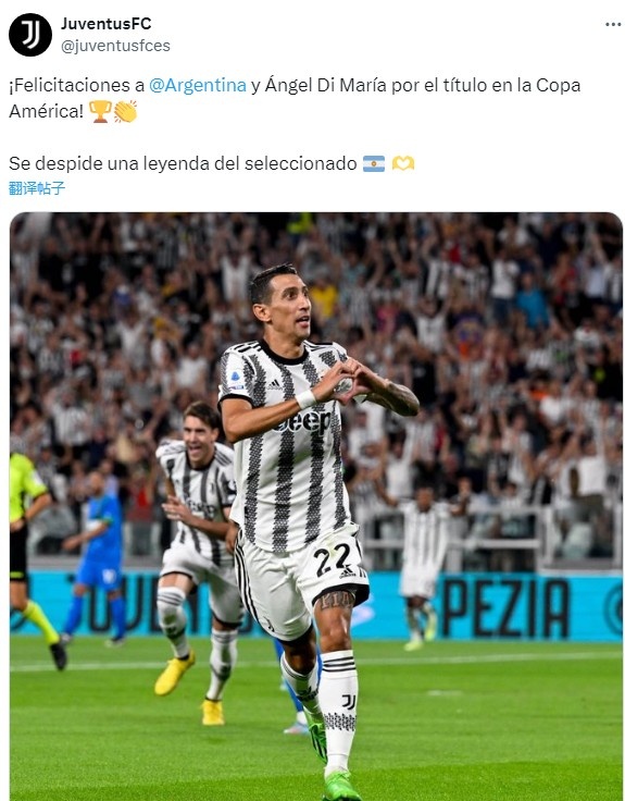 尤文官方发文:“祝贺迪马利亚和阿根廷夺得美洲杯冠军。传奇人物告别国家队。”
