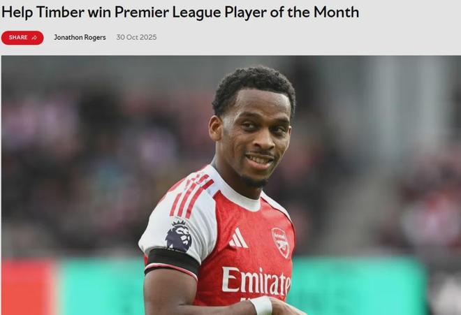 阿森纳10月最佳候选:加布里埃尔、赖斯、萨卡、廷贝尔