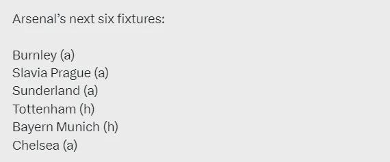 阿森纳未来6场比赛:客战伯恩利,客战布拉格斯拉维亚、客战桑德兰、主战热刺、主战拜仁、客战切尔西。