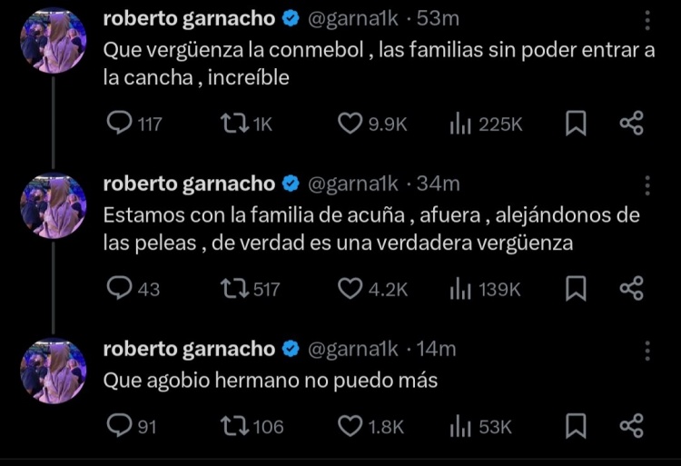 阿根廷国脚加纳乔的哥哥罗伯托发帖表示,他们和阿库尼亚的家人在一起,无法进场,并吐槽这一情况令人感到耻辱。