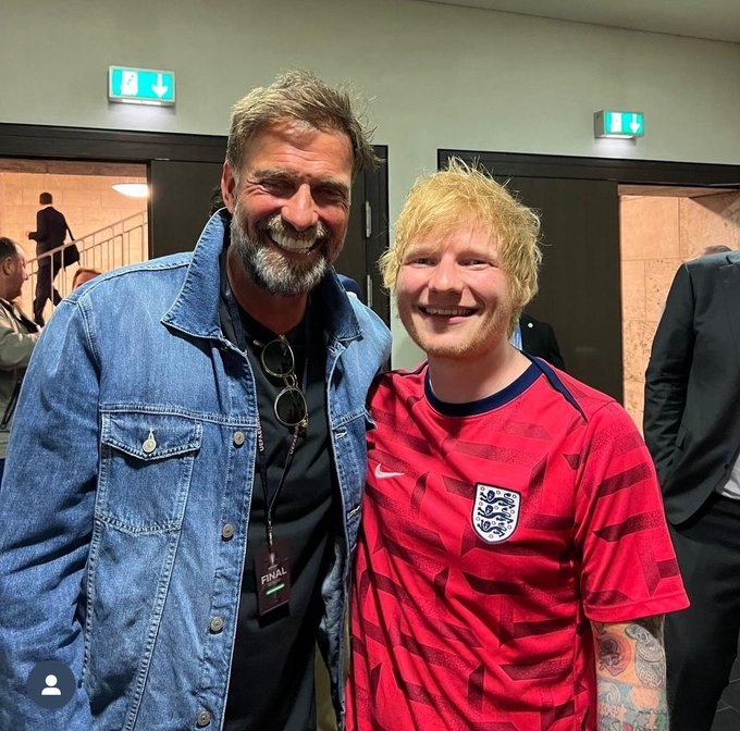 7月16日报道 欧洲杯决赛的看台上,利物浦功勋主帅克洛普是观众之一。卸任利物浦主帅后,克洛普显然没有了昔日的诸多压力,他看起来心情不错并在社交媒体上晒出了和著名歌手“黄老板”(Ed Sheeran)以及德国籍NBA球星施罗德的合影。