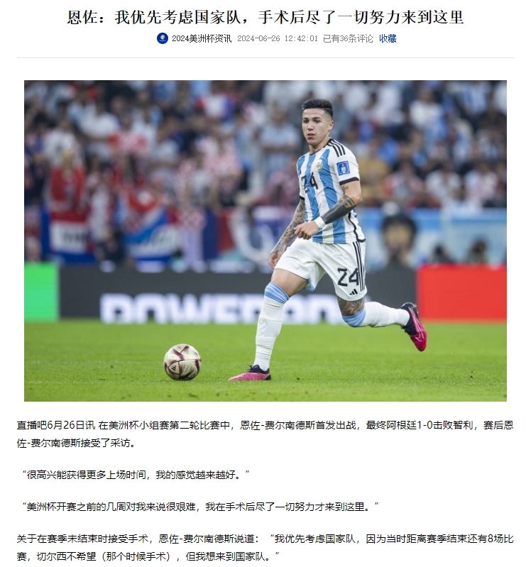 美洲杯进行期间,恩佐透露,当时切尔西不希望他接受手术,而他为了参加美洲杯选择了手术。恩佐说:“我优先考虑国家队,因为当时距离赛季结束还有8场比赛,切尔西不希望(那个时候手术),但我想来到国家队。”