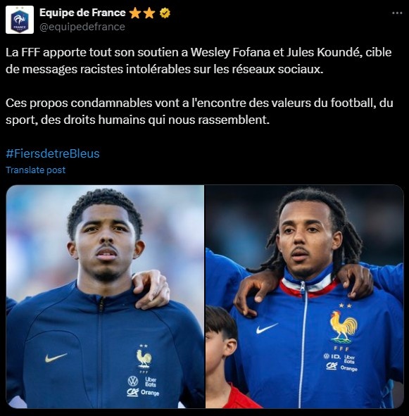 对此,法国国家队官推写道:“法国足协全力支持韦斯利-福法纳和孔德,他们在社交网络上成为了令人无法容忍的种族主义言论的目标。”