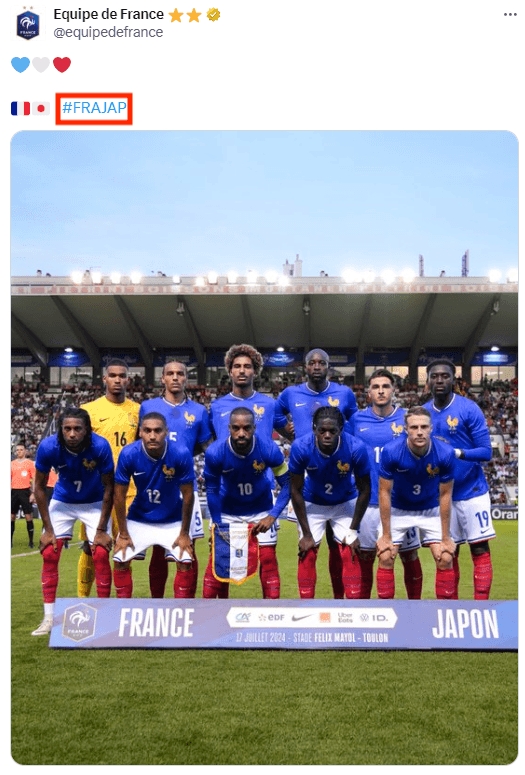 法国队官推在发布相关信息时按常规带上了两队名称的缩写词条——#FRAJAP。FRA是FRANCE的前三个字母,而JAP是JAPON(法语中的日本)的前三个字母。
