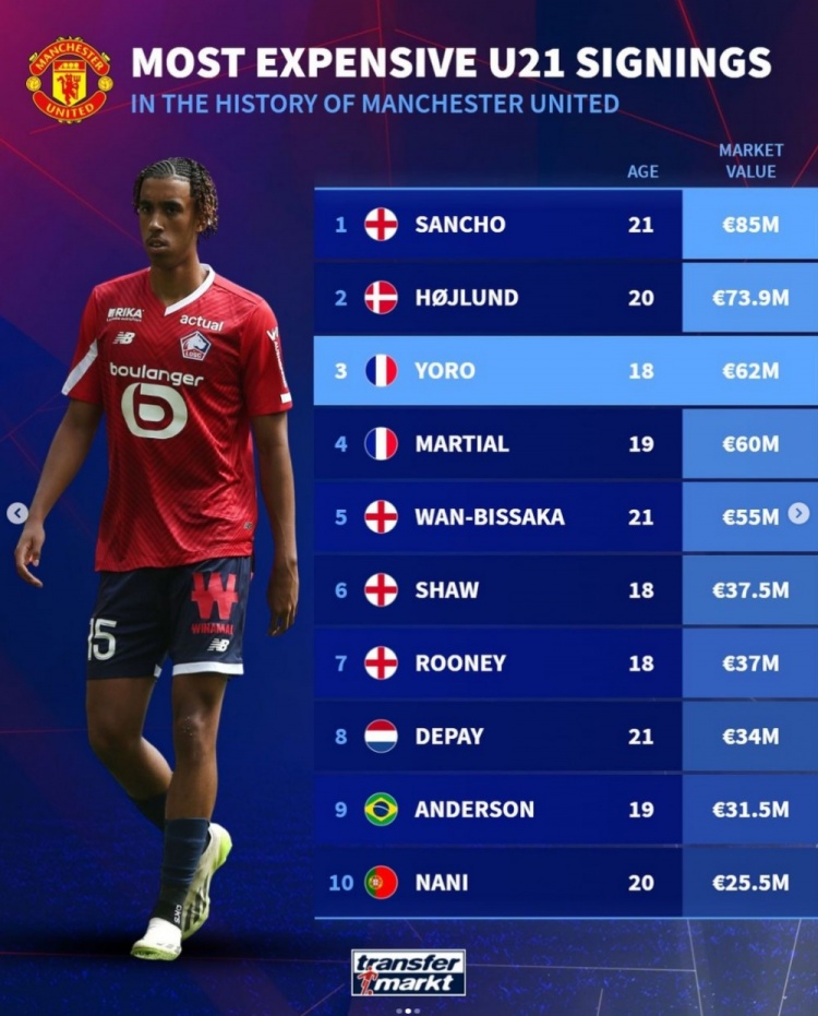 7月19日报道 德国转会市场盘点了曼联U21球员转会费历史,新援约罗以6200万欧元排名第三。