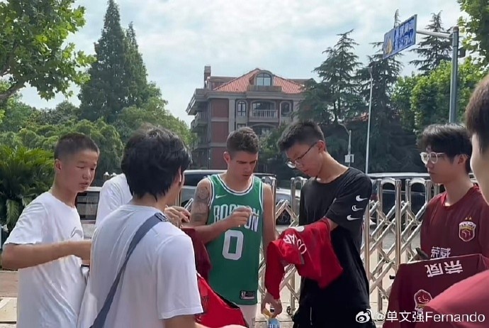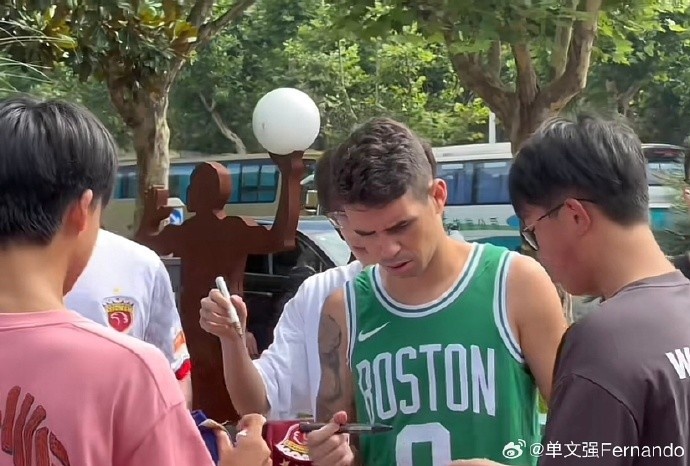 这位博主晒出的照片中,奥斯卡身穿塔图姆球衣,在海港俱乐部基地上海世纪公园内为球迷签名合影。