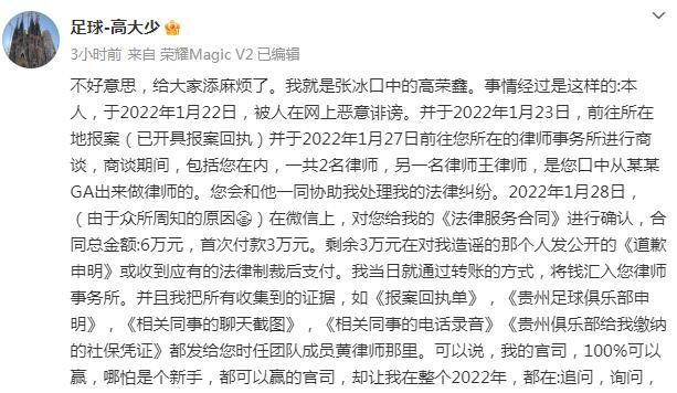 7月19日报道 今天,前申花助教高荣鑫在个人社媒发文,控诉律师张冰收了他3万块却不办事。